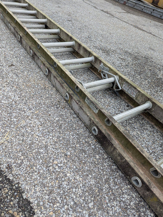 Fiberglass 40 foot extension, feet, locks, pulley in working order. Base and fly are straight