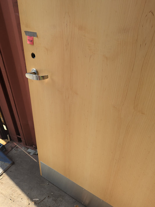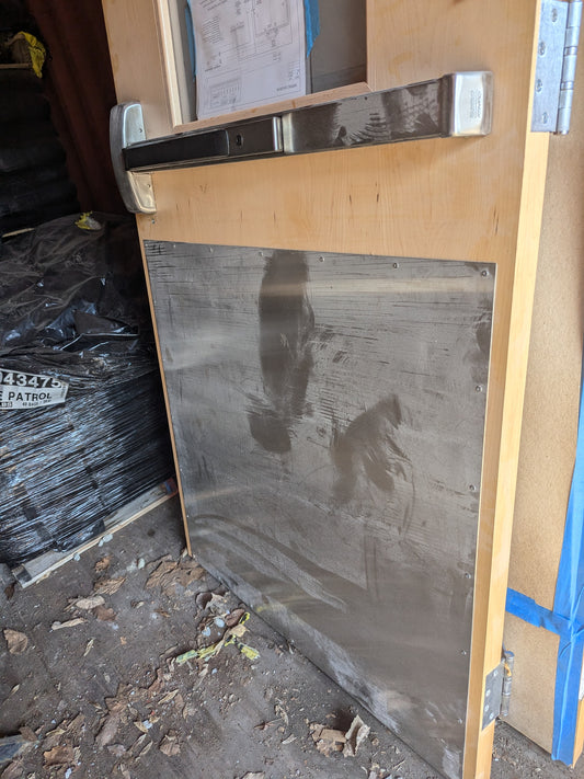 3'0"x 7'0" RH Interior solid fire rated panic hardware. 18"x33" window kick plate
