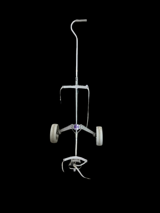 Bag Boy Play Day Automatic Golf Push Cart. USA Silver metal. Folds up for easy storage. With straps for golf bag. Rolls smooth.