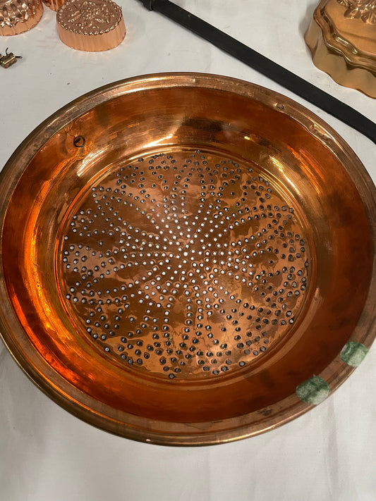 Copper dinner set. Includes four cups two big dishes, three small dishes and copper skillet with hood