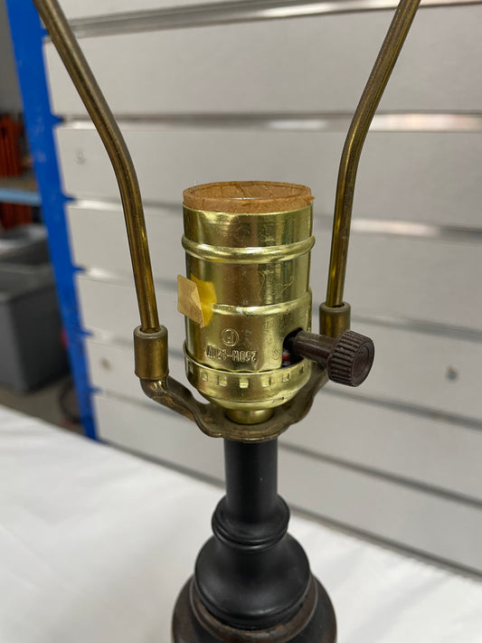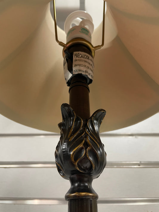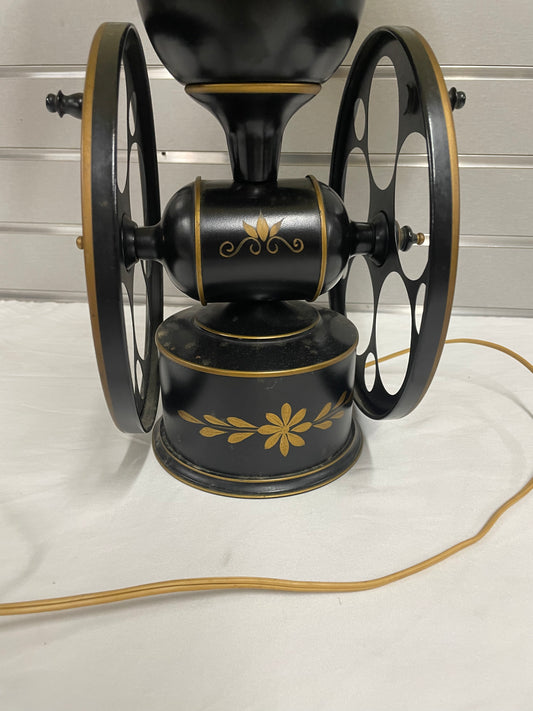 Black and Gold Wheel Lamp with Beige Lamp Shade. Lamp is 27” tall and shade is 14” wide.