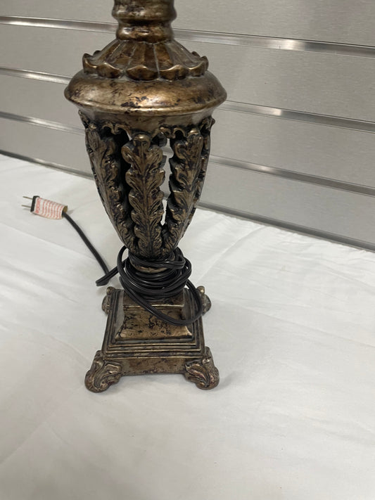 Two Gold Lamps with Lamp Shades. 30” tall and the shade is 18” wide. Lamp shade is white.