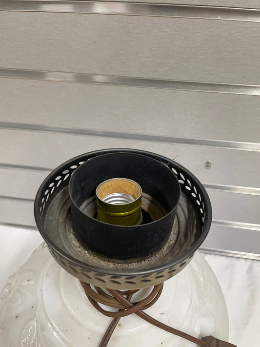 Bronze Ceramic Lamp with Whote glass lamp shade. 18.5” tall and the glass shade is 7” wide.