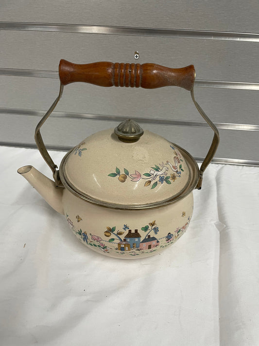 Old vintage ceramic teapot with wooden handle. Hand painted farm scene on the sides. Teapot is a peach color and has no damage to it
