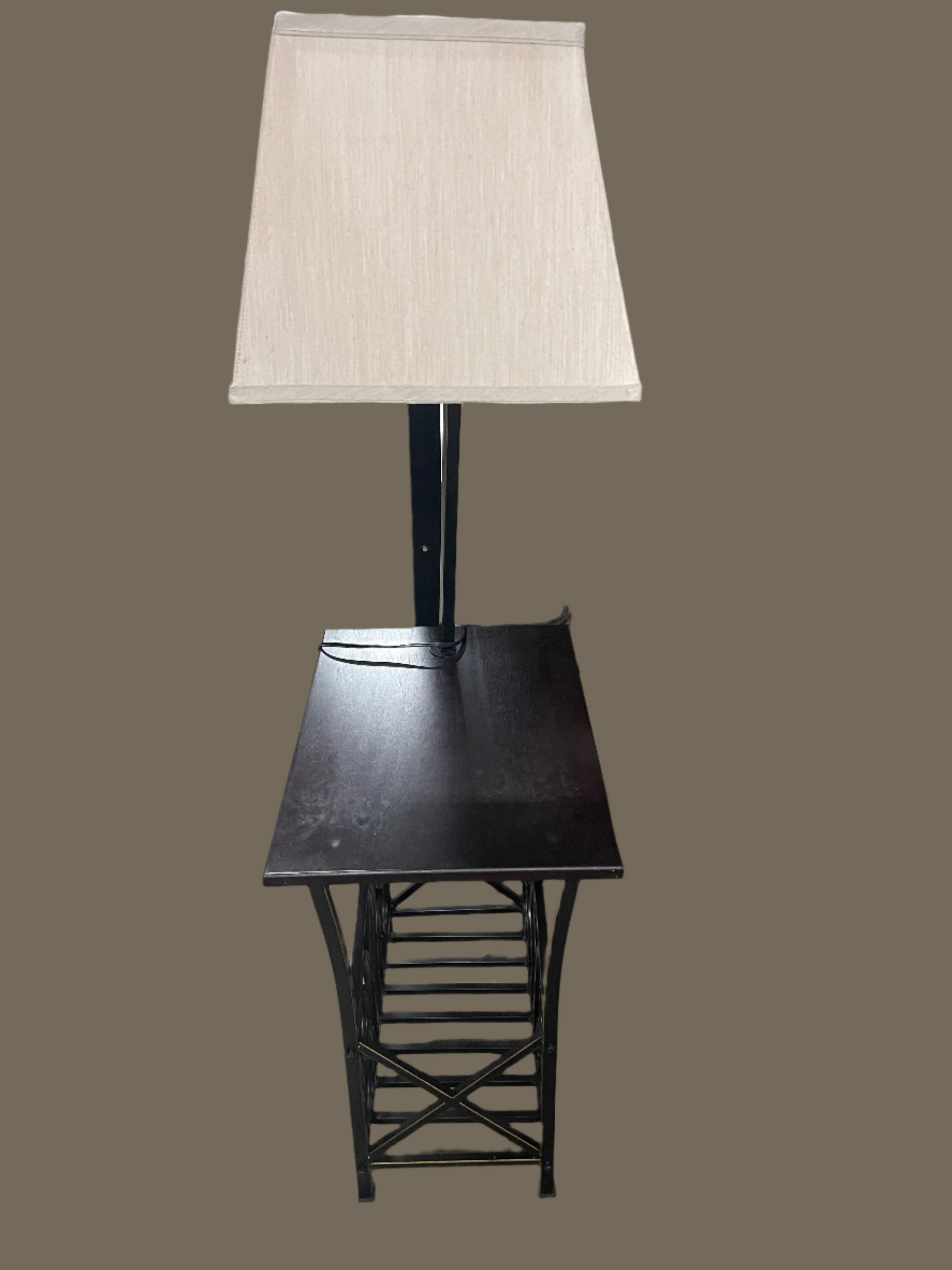Lakeland Furniture Wooden Nightstand Lamp Magazine Rack Table. With storage. White lamp shade. One piece. 52in tall. 20in long. 14in wide. 5169557